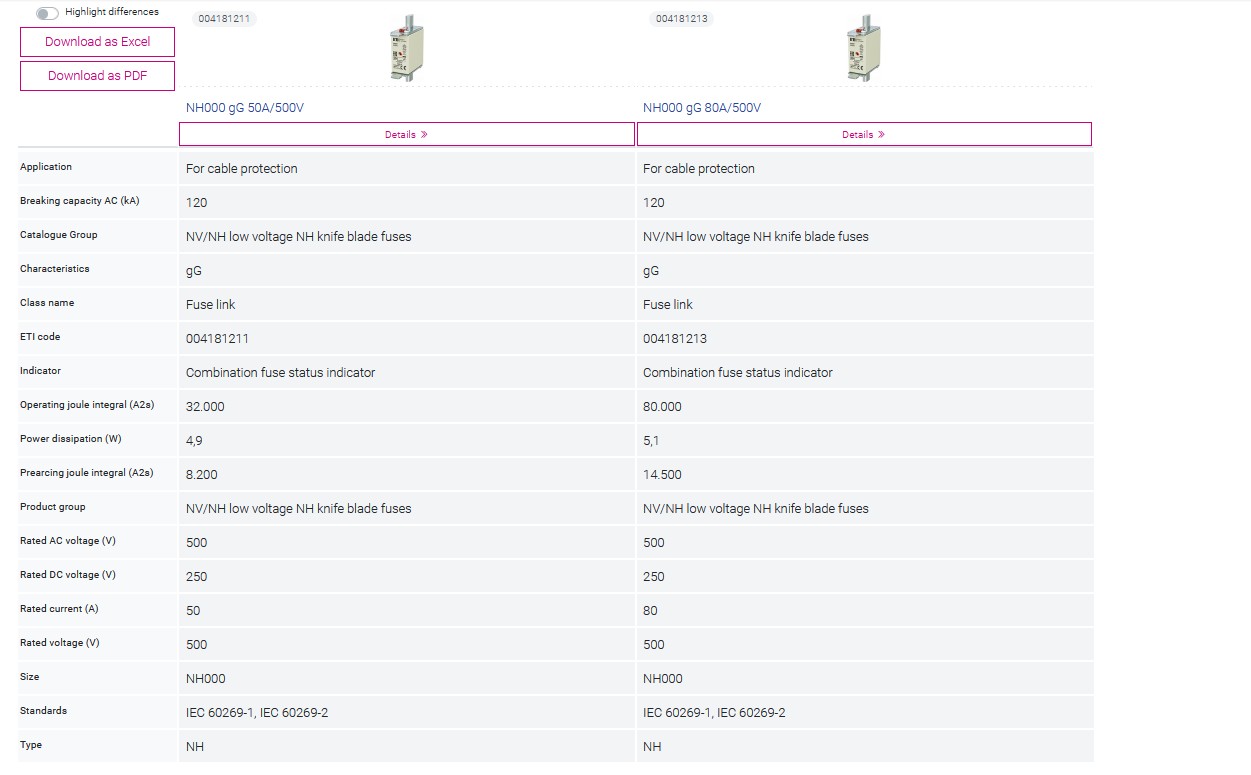 Table: comparison of the technical data of NV 50 A and NV 80 A fuse-links